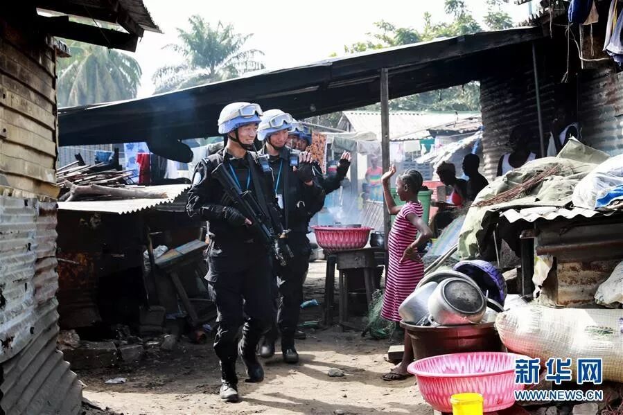 ▲这是2018年2月7日,在利比里亚首都蒙罗维亚,中国维和警察防暴队在当地社区开展徒步武装巡逻勤务。新华社发(赵小新摄)