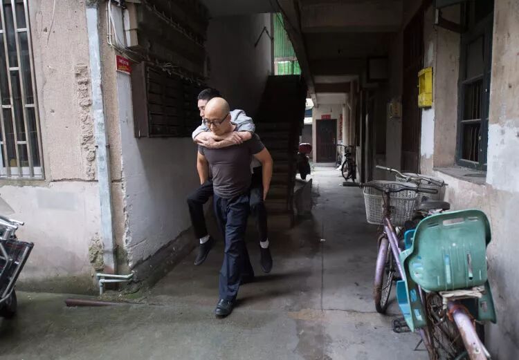 张海林背着吴元渺去参加爱心服务队的公益活动。