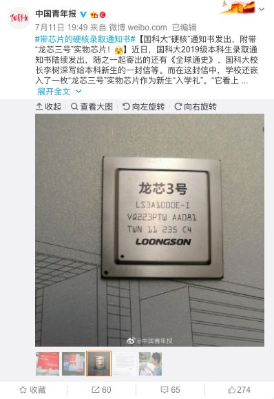 而在这封信中,学校还嵌入了一枚“龙芯三号”实物芯片作为新生“入学礼”。