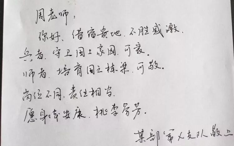 第二天早上,周老师赶到学校,发现办公室里干净整齐,如同原样。他没有见到武警官兵,但在那张白纸上,多了一段“回复”: