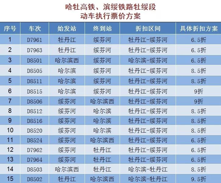 该票价方案执行时间自2019年7月10日起至另行通知时止。除上述公布折扣动车外,哈佳铁路其他动车组列车票价按公布票价9.47折执行。