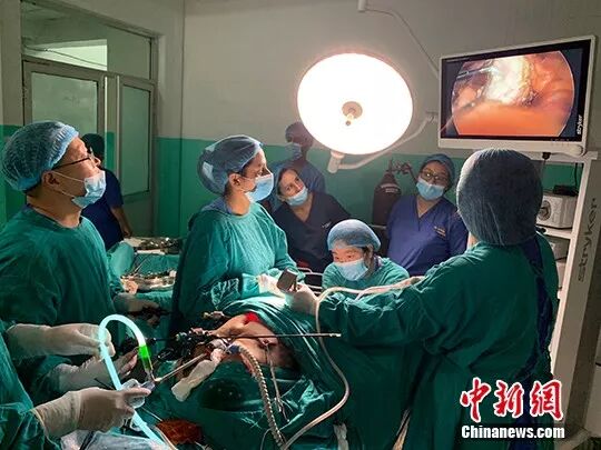 第12批援尼泊尔医疗队医生同当地医生一起为病人做手术。