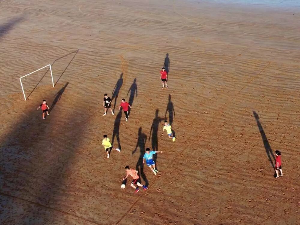“长风”足球队里的孩子都喜欢在海边踢球。