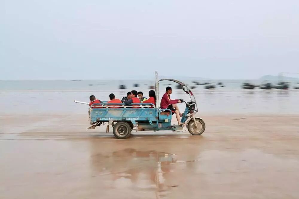 4月9日,福建省霞浦县下浒镇外浒沙滩上,“长风”足球队教练陈龙强训练结束后用三轮车载小球员们回家。新华社记者 姜克红 摄
