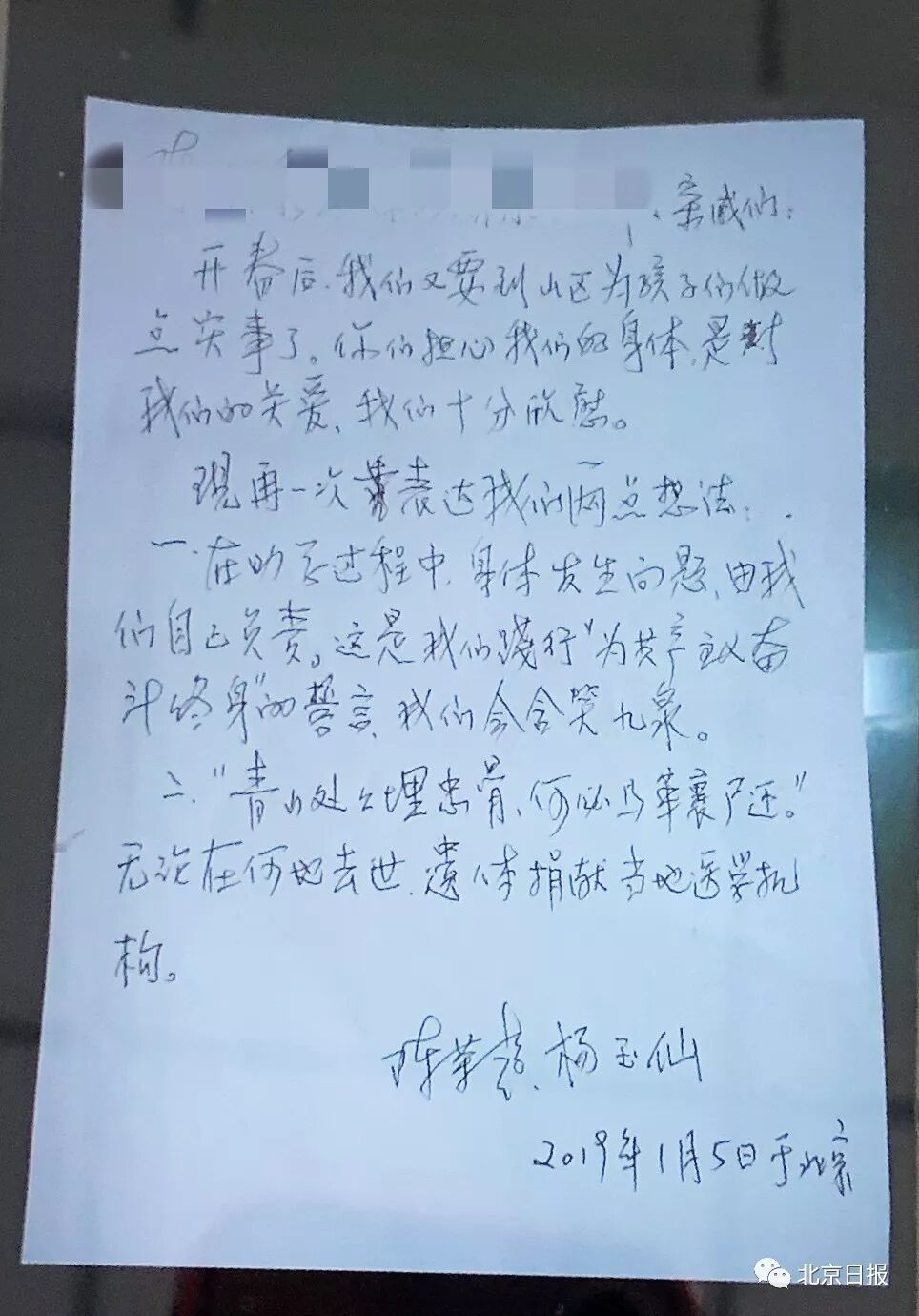 开春后,我们又要到山区为孩子们做点实事了。你们担心我们的身体,是对我们的关爱,我们十分欣慰。现再一次表达我们两点想法:一、在助学过程中,身体发生问题,由我们自己负责,这是我们践行‘为共产主义奋斗终身’的誓言,我们会含笑九泉。二、‘青山处处埋忠骨,何必马革裹尸还’,无论在何地去世,遗体捐献当地医学机构。