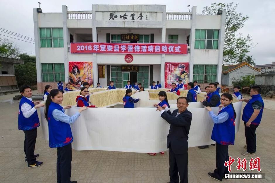 图为青年志愿者与孙衍吾在知海书屋前展示长达50米的《雷锋日记》书法长卷。骆云飞 摄
