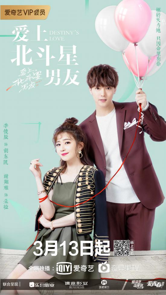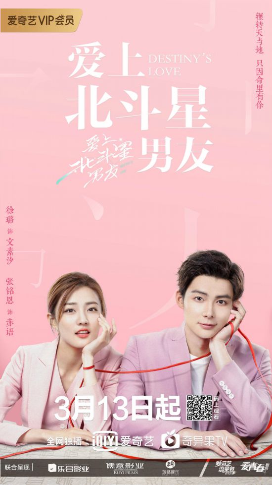 由爱奇艺出品,北京乐合,上海儒意,北京瑞格联合出品,林宏杰、陶声执导,陈祉希监制,徐璐、张铭恩、任言恺、吴昕主演的奇妙甜爱剧《爱上北斗星男友》宣布定档,将于3月13日晚20:00起爱奇艺全网独播,每周三至周五各更新2集,VIP会员抢先看6集。定档同时发布了一组“红绳”海报,剧中4组CP甜蜜初现,海报中他们身上都被一根延伸的红线环绕牵连,有缘分多是前定,红绳暗中牵系之意,也隐藏着背后错综复杂的感情纠葛。