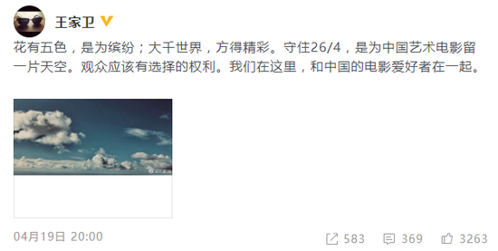 担任《撞死了一只羊》监制的王家卫对此大为不满,日前于微博留言时疑似暗讨《复联4》垄断整个市场。王导演留言说:“花有五色,是为缤纷;大千世界,方得精彩。守住26/4,是为中国艺术电影留一片天空。观众应该有选择的权利。我们在造里,和中国的电影爱好者在一起。”呼吁影迷于4月26日入戏院支持万玛才旦执导、他监制的文艺片《撞死了一只羊》。而之前万玛才旦曾表示他不怕与《复联4》同档期上映,因为他深信成熟的市场会给空间。
