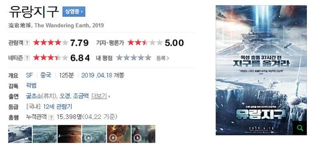 《流浪地球》目前在韩国最大门户网站NAVER的观众评分7.79。其中有45%的观众给出了10分满分,8分(含8分)以上的占比为69%。同时该片的媒体评分为5分。值得一提的是《大明猩》、《与神同行》系列等特效大片的制作公司DexterStudios也参与了《流浪地球》的特效制作工作。