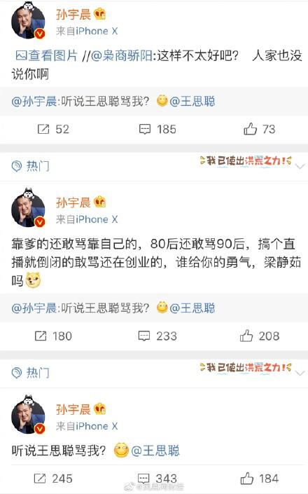据称起因是王思聪在朋友圈骂孙宇晨,孙宇晨连发三条微博怼王思聪“靠爹”,这并非二人首次交锋。五年前王思聪曾微博评价比特币是“忽悠”,随后孙宇晨评价王思聪“高帅是假的,只有富是真的”。