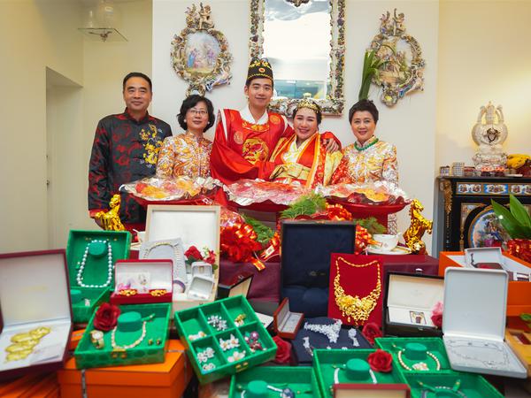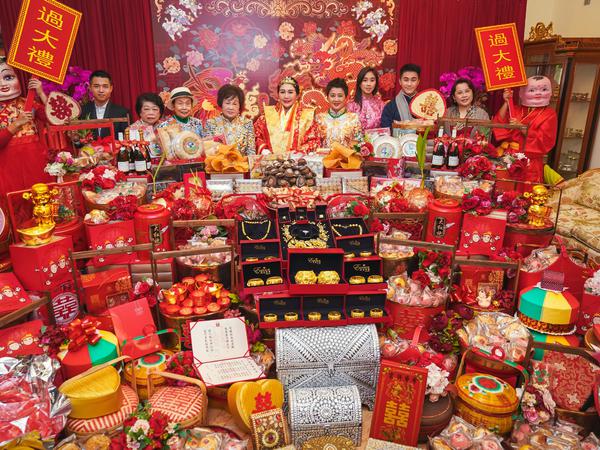 过大礼当天,何超盈未婚夫辛奇隆所送聘礼十分豪华,礼品、首饰多得令人眼花撩乱,当中包括名贵鲍参翅肚、大量钻饰、多对重量级龙凤鈪、金饰、钻饰等,闪瞎众人。女家聘礼皆由赌王何鸿燊亲自题选,全部遵照中华文化传统,非常讲究。