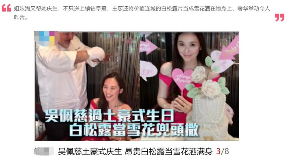 不过其实吴佩慈及她的阔太闺蜜们每次出场都非常奢华夸张,在这次将鱼子酱放手上拍照之前,她也曾在自己的生日趴上让星级米芝莲大厨直接将奢华的白松露(约13万元一斤)撒在头上,假装是在漫天雪地里浪漫庆生。。