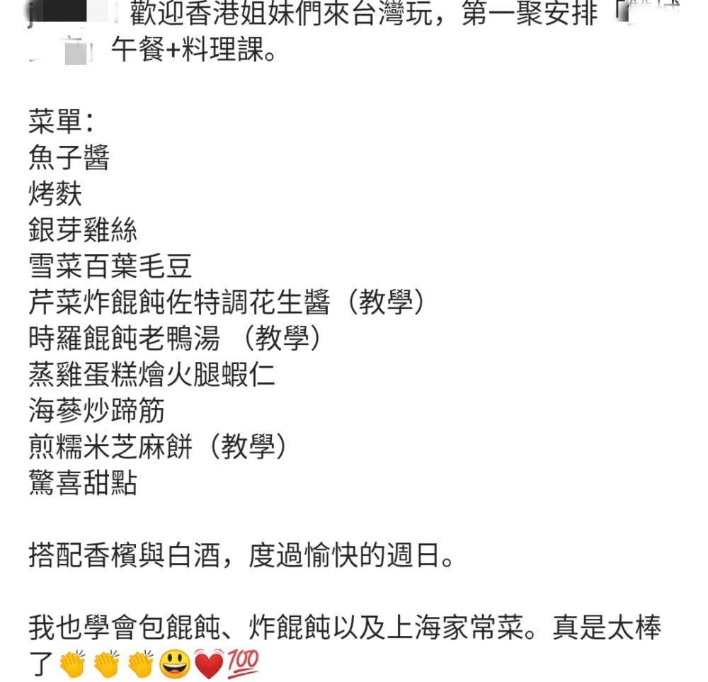 据于长君介绍,为了与远道而来的姐妹们相聚,她特意安排了众人在台北当地一家奢华餐厅就餐。除了在该餐厅午饭外,更在那里学做包馄饨、煲老鸭汤以及芝麻饼。长君说自己度过了一个非常愉快的周日。