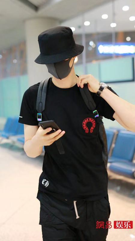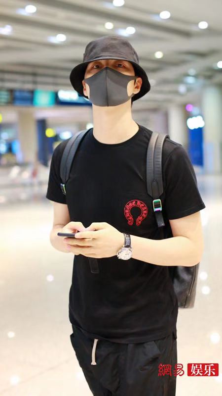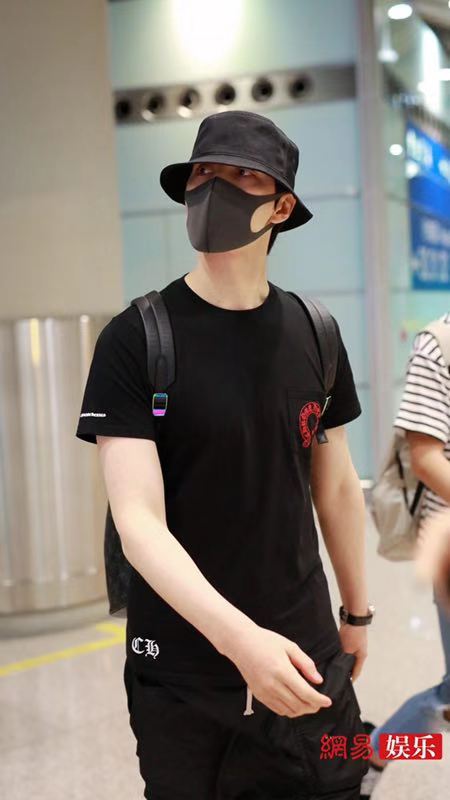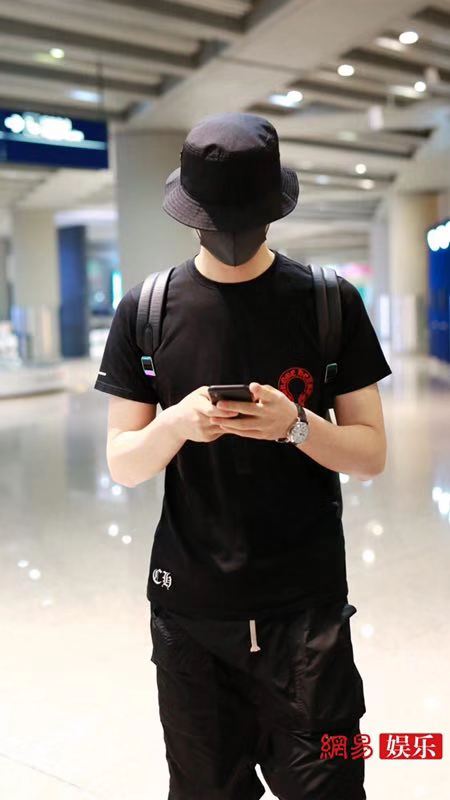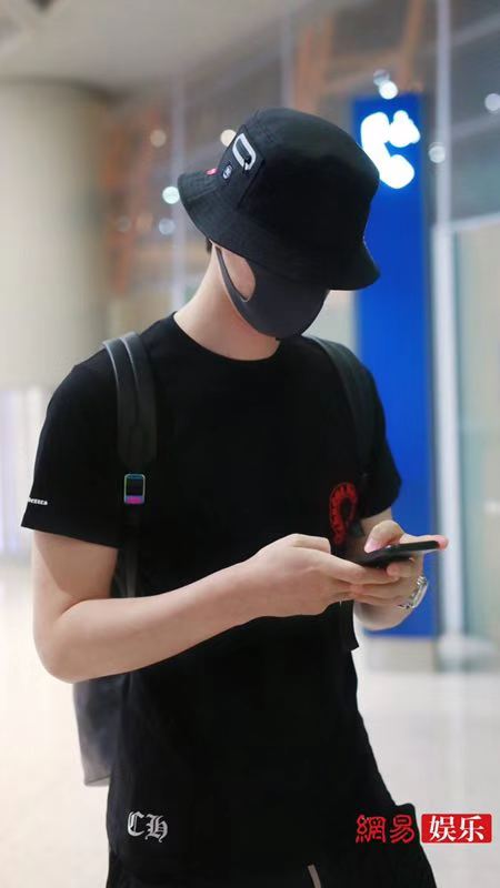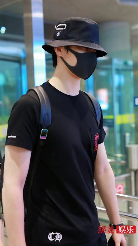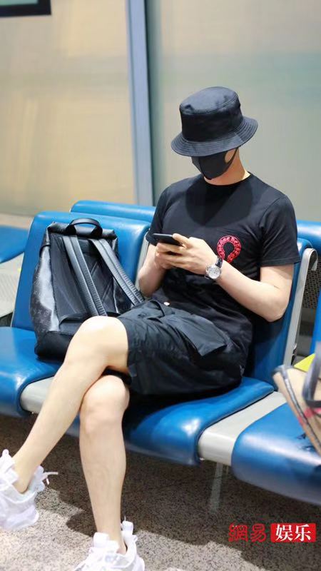 阿云嘎深夜现身机场,他头戴黑色渔夫口罩遮面,身穿黑色T恤搭配黑短裤秀出好身材。