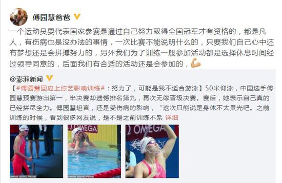 网易娱乐7月26日报道 7月25日,傅园慧爸爸转发澎湃新闻有关女儿傅园慧的报道,并配文写道:“一个运动员要代表国家参赛是通过自己努力取得全国冠军才有资格的,都是凡人,有伤病也是没办法的事情,一次比赛不能说明什么的,只要我们自己心中还有梦想还是会拼搏努力的,另外我们为了训练一般参加活动都是选择休息时间经过领导同意的,后面我们有合适的活动还是会参加的。”