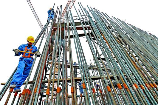 昨日,工人正在武汉杨泗港长江大桥1号塔主塔上施工。该主塔高约230米,目前施工已接近50米。该大桥是武汉首座双层公路桥。(记者 倪娜 视界网 成莉玲 摄)