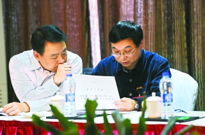 昨日在政协小组讨论现场,第八组(九三学社)市政协委员李枫(左)、胡晓华(右)正在讨论记者许魏巍 摄