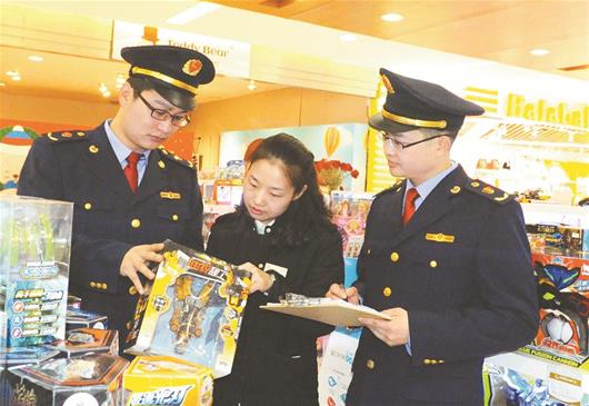 图为工商执法人员现场抽检儿童玩具。 (李斌 摄)