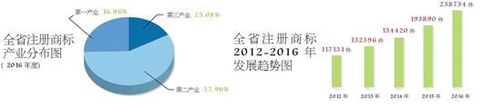 品牌实力更加壮大。全省有效注册商标达到23.9万件,驰名商标341件,居全国第7位、中部第2位;地理标志达292件,居全国第3位、中部第1位。全省品牌发展呈现量质并进的良好态势,有效注册商标在一、二、三产业的分布比例更加均衡,驰名商标、地理标志数量均比“十一五”期末增长8倍多,涌现了一批知名度较高、竞争力较强的先进制造、高新技术和服务业品牌。