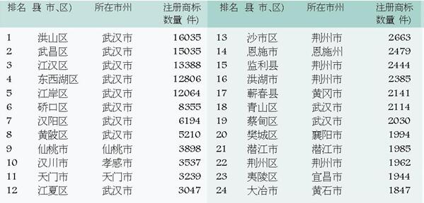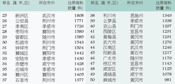 湖北省县(市、区)商标注册总量50强