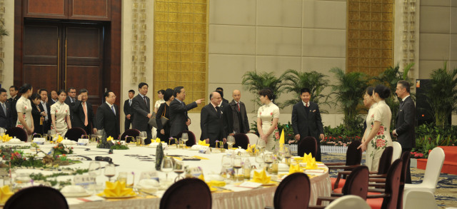 吃饭先上桌。场合特殊,宴会餐台设计也需要宾馆工作人员巧妙构思。