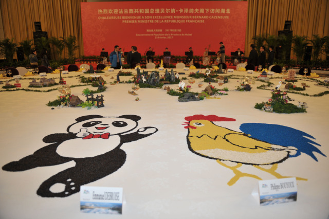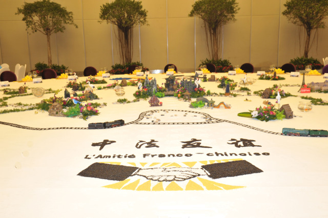 桌面上,用五谷摆出了国宝大熊猫和高卢雄鸡,象征了中法友好情谊。