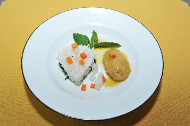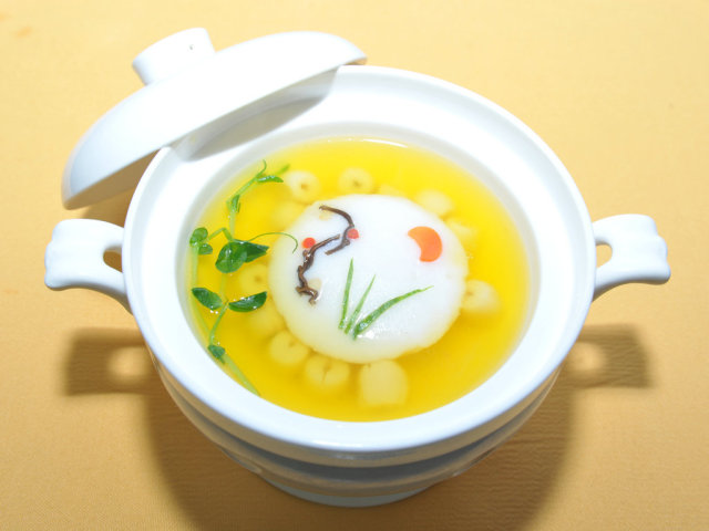 产自洪湖的莲子,配以清爽的鱼茸,让色泽金黄的汤汁清香淡雅,再点缀明月、红梅和绿叶,顿显春意盎然,生机勃勃——正如中法友谊一样。