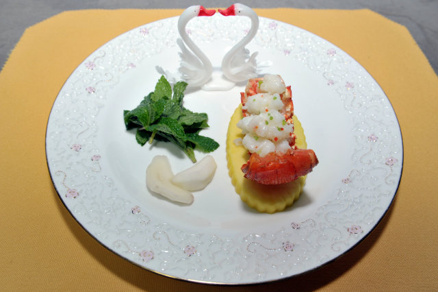 当甘甜芒果遇上口感Q弹的龙虾,还有白兰地的醇香,这道法式佳肴演绎着一段新的美食故事。而用白糖雕琢而成的一对天鹅,寓意中法之间“情比金坚”。