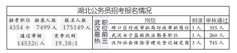 根据数据发现,湖北竞争最为激烈的职位仍是武汉市硚口区行政审批局的行政审批岗位,招录1人,已经有399人报名,截至昨天下午4点,审核通过355人,成为省考最热职位。在省考十大热门职位中,竞争比例都超过200:1。