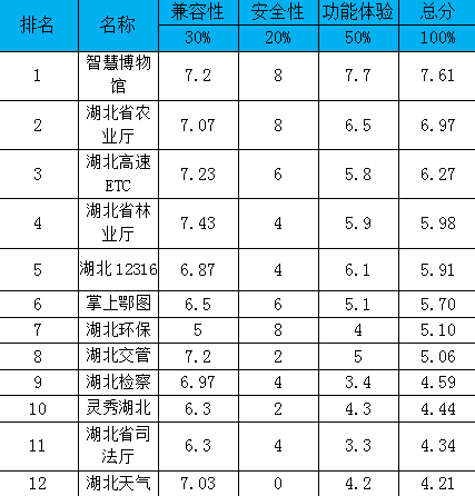首批测评对象是由湖北省省直机关、涉及公共服务领域的省级企事业单位推出的政务APP,并从中挑选了运行较为成熟、便于比较的10余款APP进行了排行。其中,湖北省博物馆发布的《智慧博物馆》APP,不仅界面精致美观,设置了语音导览等实用功能,而且还推出知识测验、文物游戏等特色娱乐互动。综合评分位居第一;《湖北司法厅》APP,在150部测试手机上无法正常运行,兼容性测试通过率仅50%,令用户体验大打折扣,排名靠后。