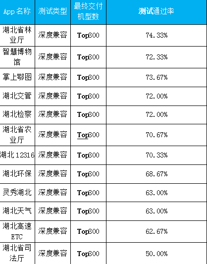 所谓兼容性测试,简单地说,就是App在不同种类的手机上能否正常运行,此项指标是App软件开发品质的一个重要体现。本次的兼容性测试中,得分最低的是《湖北省司法厅》App。该App集成了司法新闻及信息公开外,还提供律师、公证机构、司法鉴定机构等实用信息查询功能。在Top300款机型测试中,该App在150款上出现在闪退、卡顿、黑白屏等多种异常。各项兼容性测试通过率仅为50%,但移动应用App的兼容性测试通过率的正常参考值为85%。