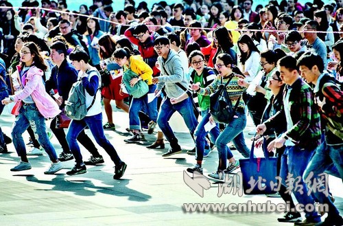 图为:昨日,武汉工商大学考点,考生冲进考场。 湖北日报记者柯皓摄