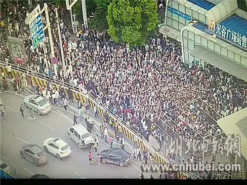据介绍,湖北省公务员招录考试于4月22日开考,又逢双休日光谷步行街游客高峰,两股人流引发短时间峰叠,如潮人流瞬间涌向光谷地铁站C出口,安全压力极大。