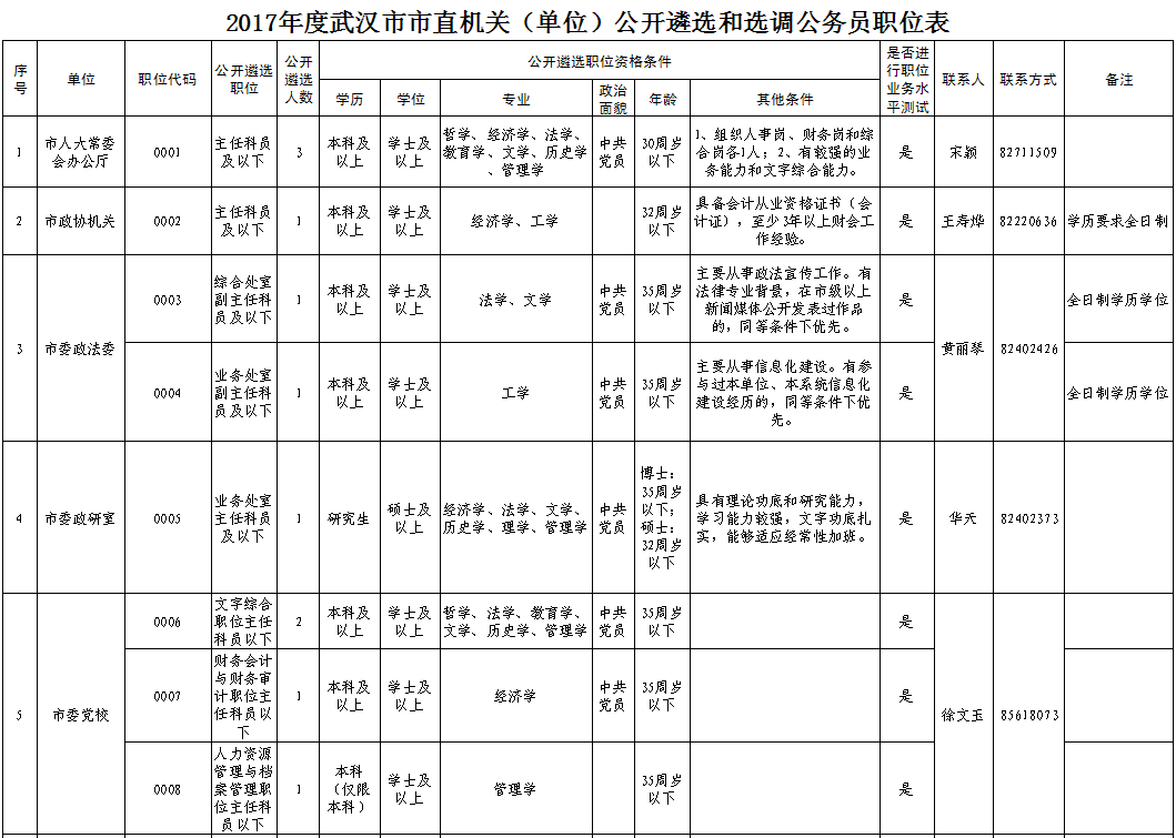 湖北日报网讯(全媒体记者陈会君)2017年度武汉市市直机关(单位)公开遴选和选调公务员工作今日启动,市人大常委会办公厅、市政协机关、市委政法委等29家机关(单位)总计遴选和选调71名公务员。