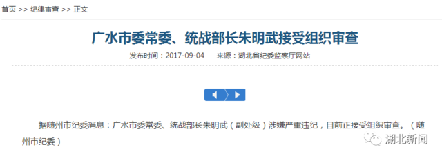 据随州市纪委消息:广水市委常委、统战部长朱明武(副处级)涉嫌严重违纪,目前正接受组织审查。(随州市纪委)