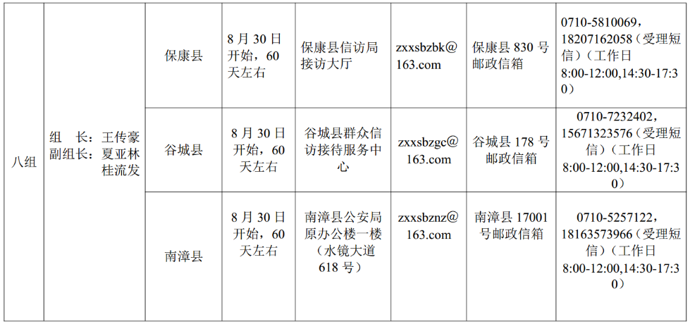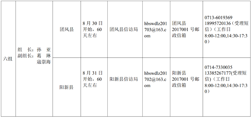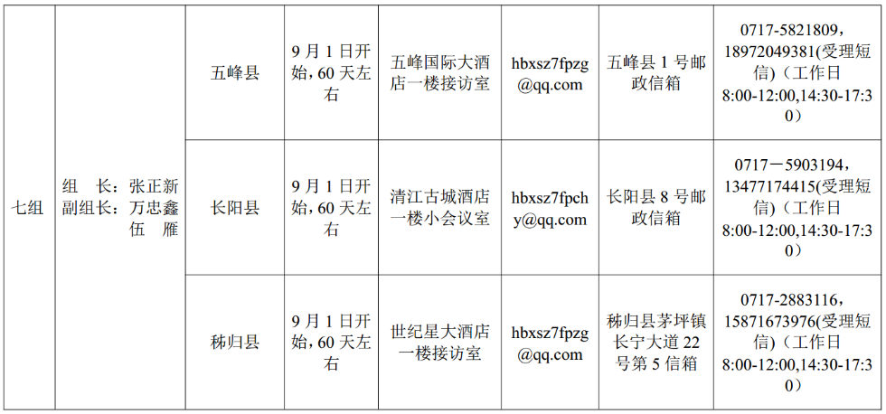 省委巡视组进驻情况一览表详见本报“看楚天”手机客户端。根据巡视工作条例规定,省委巡视组主要受理反映被巡视县(市、区)委、政府领导班子及其相关成员,县(市、区)纪委监察局领导班子及其相关成员,乡镇(街道)主要负责人问题的来信来访,重点是关于贯彻落实中央和省委扶贫脱贫工作决策部署不坚决不到位,弄虚作假、扶贫工作不务实,以及对扶贫资金贪污挪用、截留私分、优亲厚友、虚报冒领、雁过拔毛、挤占掠夺等方面的举报和反映。其他不属于巡视受理范围的信访问题,按规定由被巡视单位和有关部门分别处理。