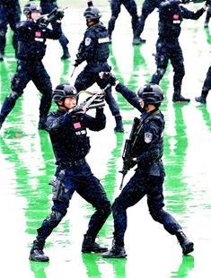 武汉市公安局演示的红蓝对抗战术射击中,10名特警队员分成2个战斗小组对抗,以最先消灭所有目标为胜。其中,2名女特警队员,巾帼不让须眉,表现十分抢眼。