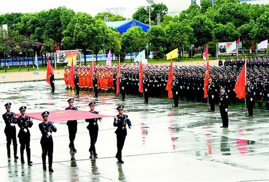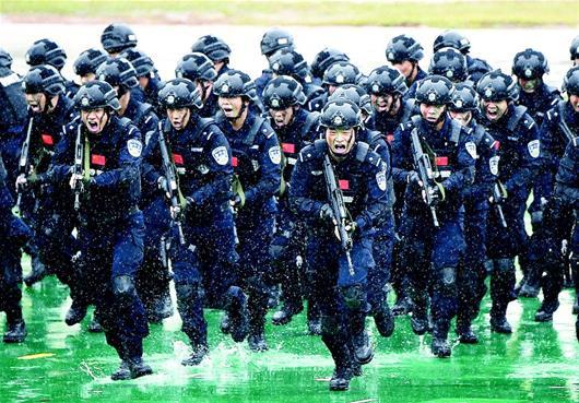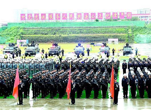 向左、向右转,跑步走!一、二、三、四……2600多名公安民警和现役官兵雨中集结、整齐列阵。