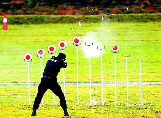 “前方还有‘敌人’,继续前进。”红方的一男一女两名特警队员迅速翻越矮墙,使用手枪对前方碟子靶进行快速射击,再次命中目标。