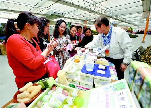 图为昨日,游客体验台湾特色产品。当天,台湾农业嘉年华在武汉东西湖区农业嘉年华园区举行。 (记者 张朋 摄)