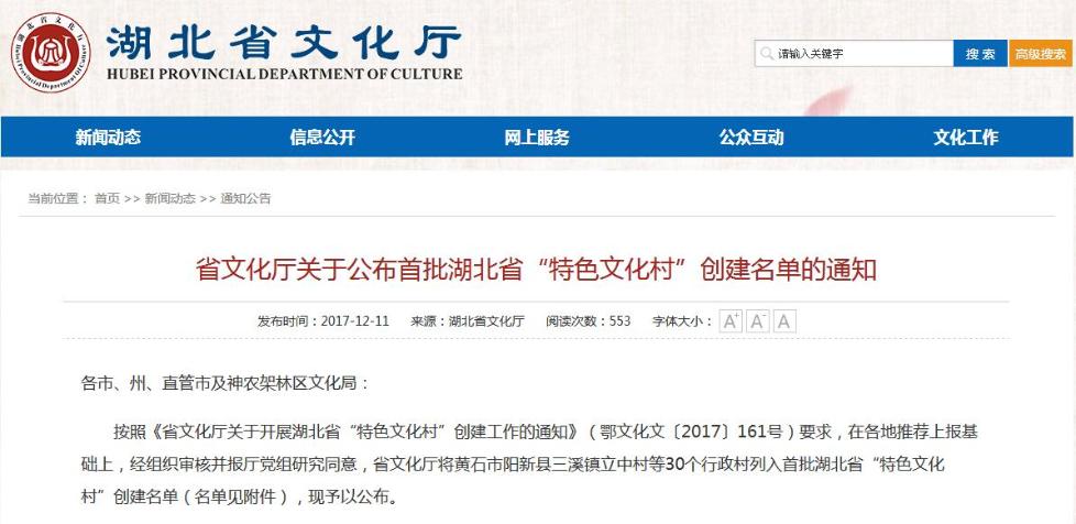 据湖北省文化厅网站消息,首批湖北省“特色文化村”创建名单公布,共30个行政村入选 ,其中十堰7个,恩施土家族苗族自治州6个,宜昌5个,黄冈、咸宁各3个,襄阳、孝感各2个,黄石、神农架林区各1个。