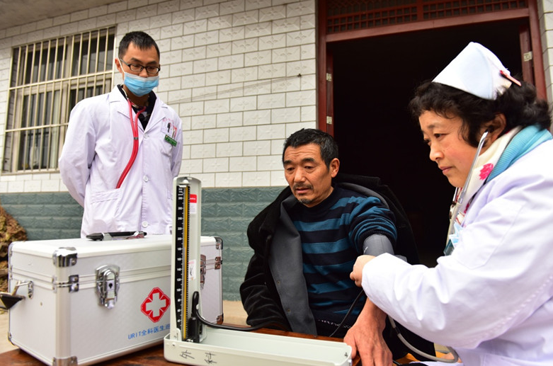 2017年1月24日,在湖北省秭归县郭家坝镇文化村,护士黄萍(右一)在为签约村民鲁成恒(中)测量血压。