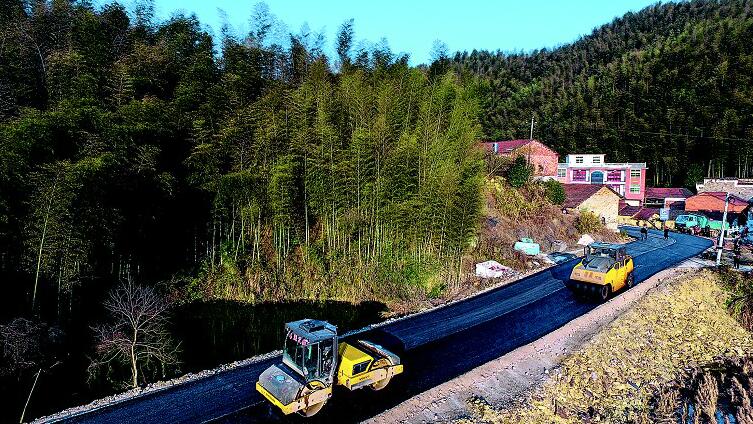 左图:1月11日,大幕乡双垅村至双溪镇李容村的扶贫公路正在进行路面刷黑施工。