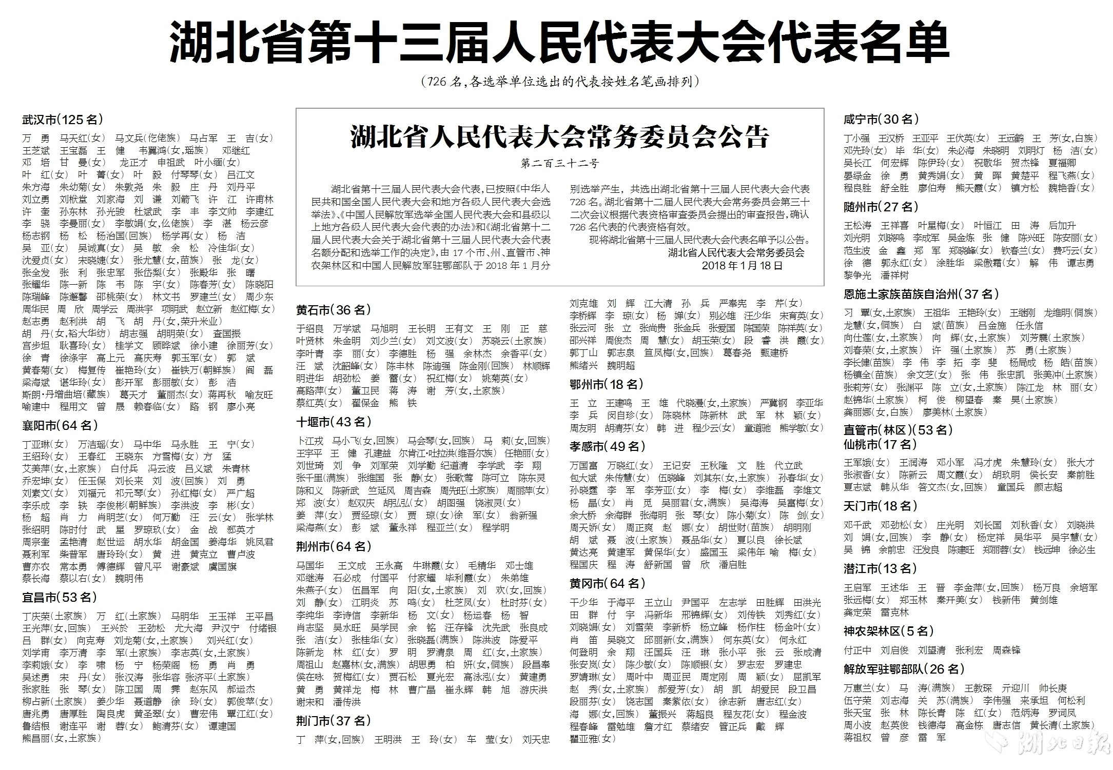 湖北日报讯 湖北省第十三届人民代表大会代表,已按照《中华人民共和国全国人民代表大会和地方各级人民代表大会选举法》、《中国人民解放军选举全国人民代表大会和县级以上地方各级人民代表大会代表的办法》和《湖北省第十二届人民代表大会关于湖北省第十三届人民代表大会代表名额分配和选举工作的决定》,由17个市、州、直管市、神农架林区和中国人民解放军驻鄂部队于2018年1月分别选举产生,共选出湖北省第十三届人民代表大会代表726名。湖北省第十二届人民代表大会常务委员会第三十二次会议根据代表资格审查委员会提出的审查报告,确认726名代表的代表资格有效。