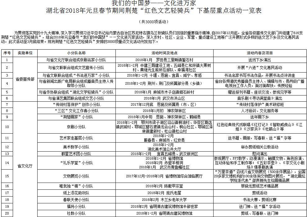 为贯彻落实党的十九大精神,深入学习贯彻习近平总书记给内蒙古自治区苏尼特右旗乌兰牧骑队员们回信的重要指示精神,自2017年12月起,全省各级宣传文化部门共组建了616支荆楚“红色文艺轻骑兵”,结合2018年元旦春节“我们的中国梦”——文化进万家活动,深入农村、社区、企业、军营、重点建设工地等广泛开展形式多样的送文艺下乡及文化惠民活动,此次活动至3月底结束。现将荆楚“红色文艺轻骑兵”安排的3000项重点文化活动刊发如下。