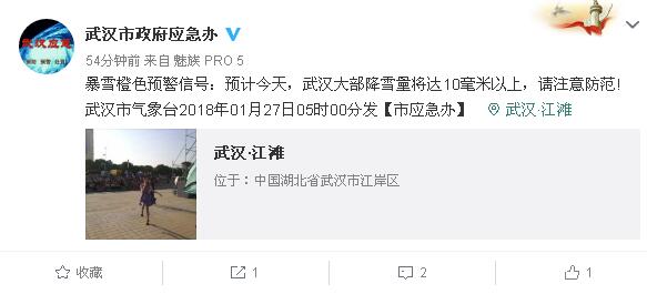 暴雪橙色预警信号:预计今天,武汉大部降雪量将达10毫米以上,请注意防范!武汉市气象台2018年01月27日05时00分发【市应急办】