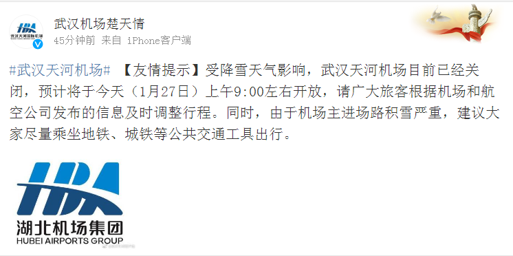 #武汉天河机场#【友情提示】受降雪天气影响,武汉天河机场目前已经关闭,预计将于今天(1月27日)上午9:00左右开放,请广大旅客根据机场和航空公司发布的信息及时调整行程。同时,由于机场主进场路积雪严重,建议大家尽量乘坐地铁、城铁等公共交通工具出行。