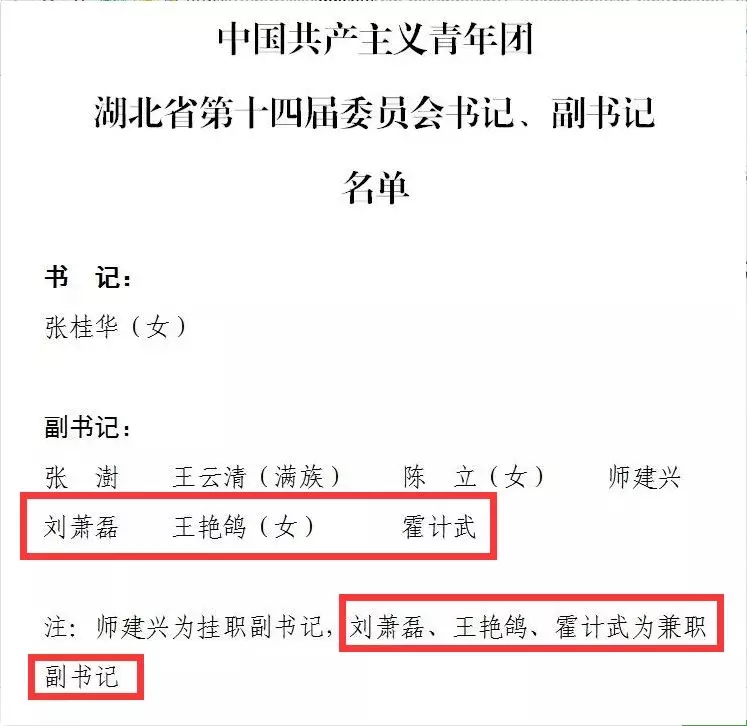 湖北日报微信(ID:hubeiribao181)注意到,兼职团省委副书记的刘萧磊、王艳鸽和霍计武三人,个个来历不凡。