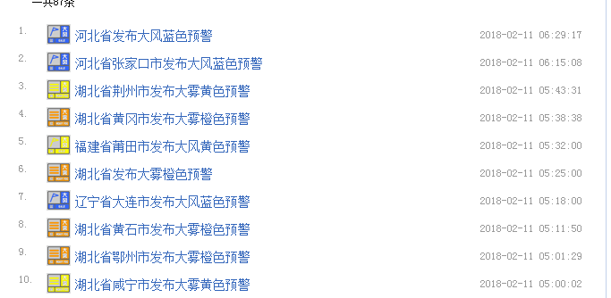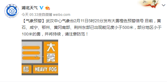 据@湖北天气【气象预警】武汉中心气象台2月11日5时25分发布大雾橙色预警信号:目前,黄石、咸宁、鄂州、黄冈南部、荆州东部已出现能见度小于500米,部分地区小于100米的雾,并将持续,请注意防范!