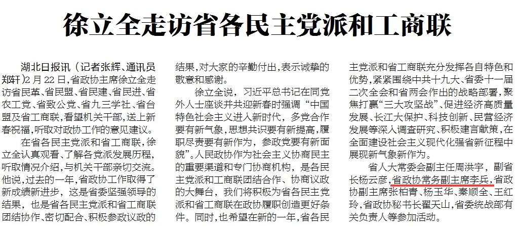 据湖北日报2月23日消息,李兵以湖北省政协常务副主席身份,参加了走访省各民主党派和工商联活动。此前,在政协湖北省第十二届委员会第一次会议上,李兵等9人当选省政协副主席。
